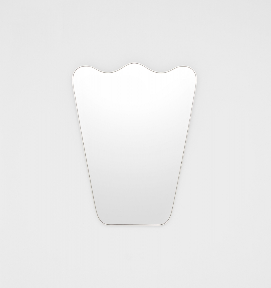 The Agnes Mirror features a tapered design with a scalloped upper edge.